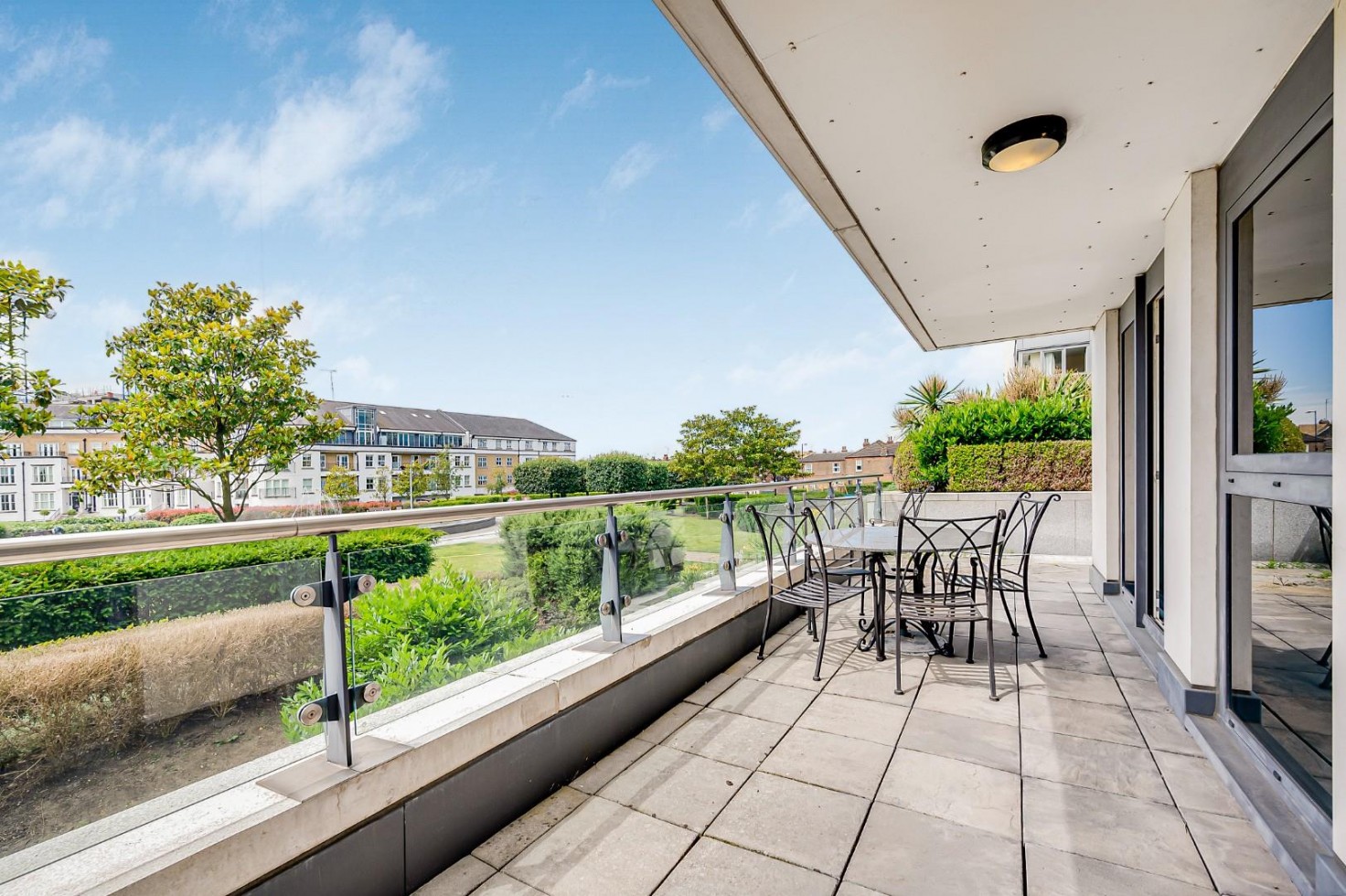 Set in a prime position within Box Tree House, this beautifully presented two-bedroom apartment offers direct views over Imperial Park and a generous private terrace (410sqft / 38.1 sq